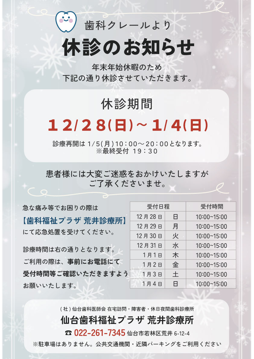 休診期間中に急なお痛みなどの場合は、「仙台歯科福祉プラザ」022-261-7345をご利用いただけます。